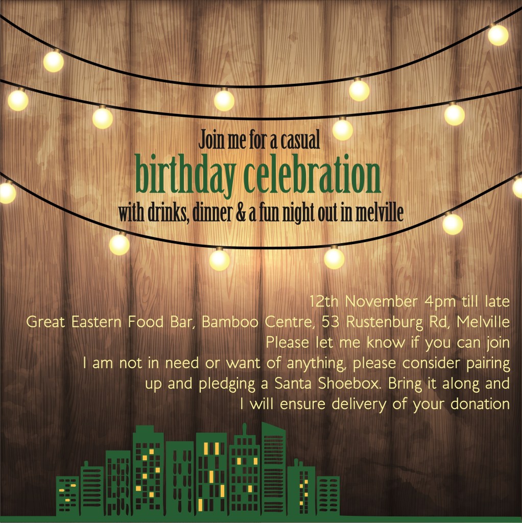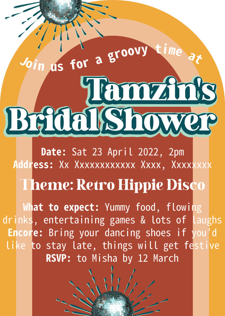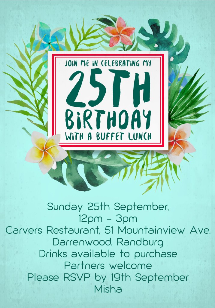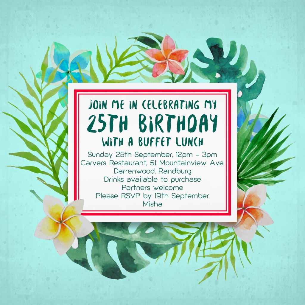 Disco Bridal Shower, Feb 2022Wedding Save the Date, Oct 2021Chalkboard Nappy Braai Invitation, Feb 202180th Flower Birthday Invitation, May 2019BYOB Birthday Invitation, Aug 2019Tennis & Gin Birthday Invitation, Jun 2018Vintage Car Birthday Invitation, Jul 2018Mexican Bachelorette Save the Date, May 2017Tropical Birthday Invitation, Sep 2016Indian Dinner Party Invitation, Jul 2016Elephant Baby Shower Invitation, Feb 2015Indian Dinner Party Invitation, Jul 2016